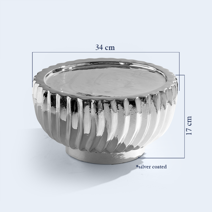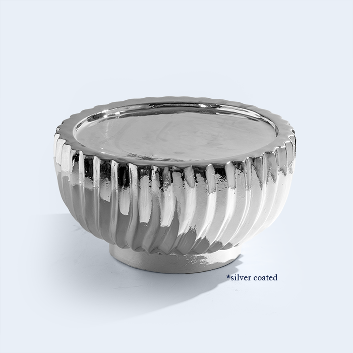 Gleamgroove is a ribbed pedestal tray with a silver-coated mirror finish, designed to reflect light in elegant, flowing lines.