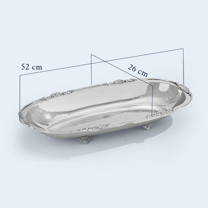 Named after the Greek goddess of the hearth, this elongated silver tray embodies warmth, abundance, and timeless elegance. Resting on ornate feet, its polished surface and delicately sculpted rim make it a graceful vessel for gatherings, echoing the spirit of hospitality and refined beauty.