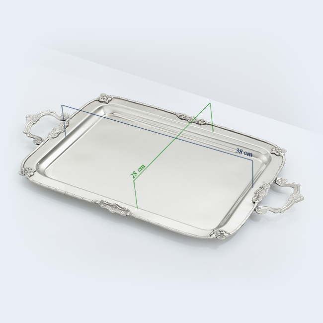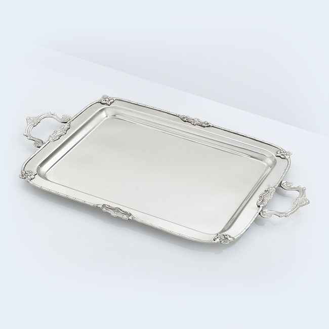 Rich in detail and timeless in design, the Lavinia tray features a polished steel finish with ornate flourishes along its frame and sculpted handles. Its regal silhouette evokes classic elegance—perfect for refined gatherings, special occasions, or as a statement piece in any setting.