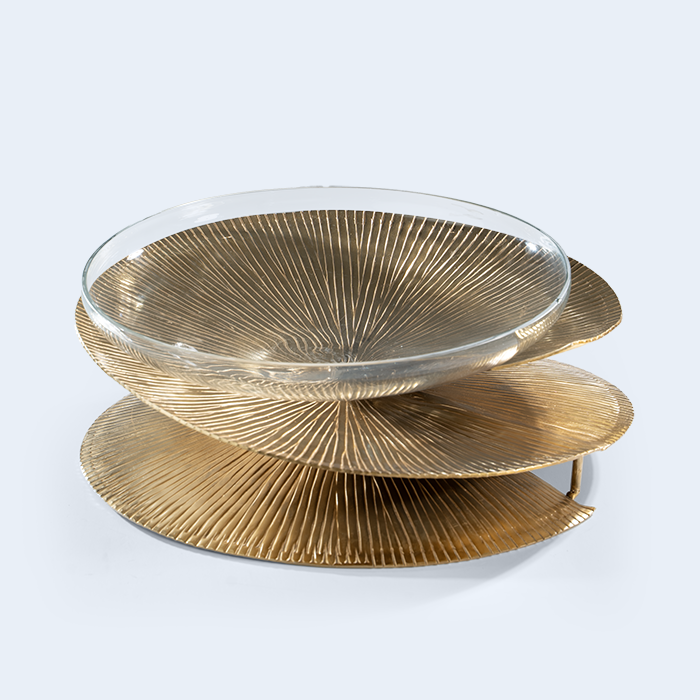 Lokah – Sculpted Harmony The Lokah Tray is a statement of balance and beauty, inspired by the rhythm of nature. Its tiered, fan-like golden layers radiate outward in sun-kissed lines, creating a sculptural base that feels both organic and modern. A clear glass bowl rests above, adding a touch of lightness while enhancing the tray’s luminous form.