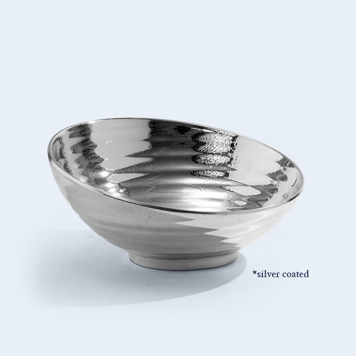 ShoreGleam is a silver-coated bowl tray with soft ripple textures and a luminous mirror shine.