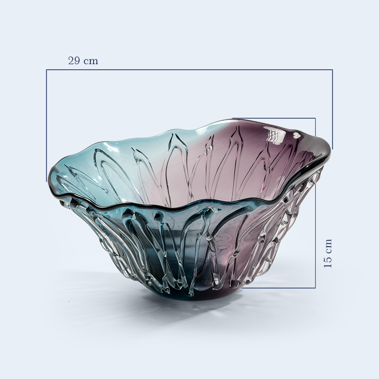 Calydra Bowl – A sculpted glass centerpiece in shifting teal and plum tones, Calydra flows like liquid petals, perfect for presenting chocolates, fruits, or florals with modern, artistic elegance.