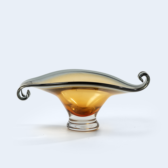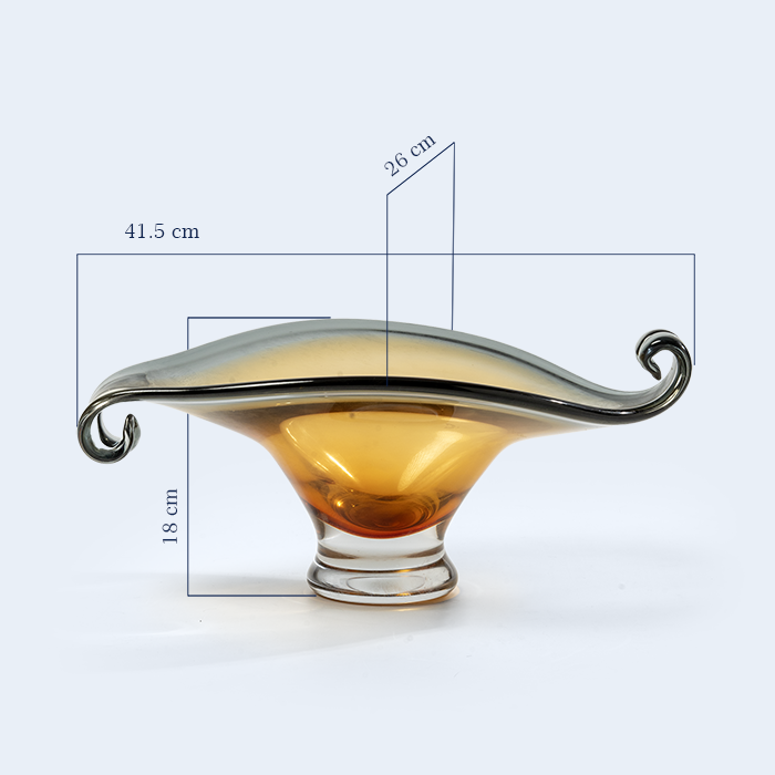 Lykris Tray – A sculptural amber-and-smoke glass centerpiece with curled Greek-inspired ends, perfect for presenting chocolates, dates, or flowers with quiet luxury.