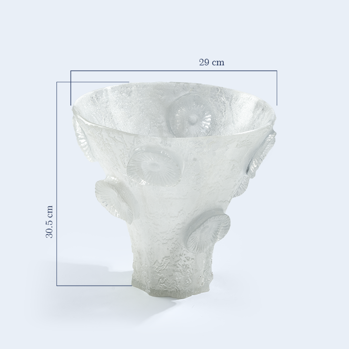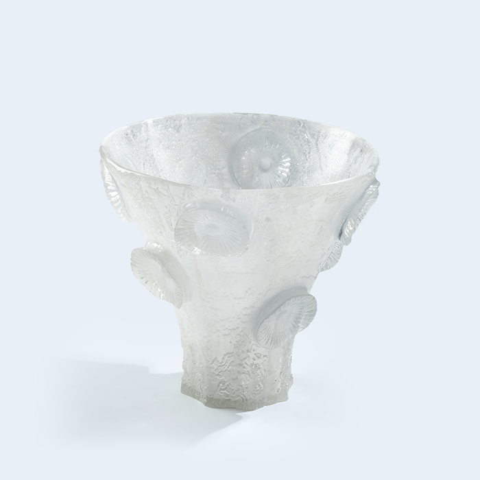 Novelle Iced is a sculpted glass vase-tray with a frosted, snow-like finish and delicate circular motifs that feel like pressed blooms in ice.