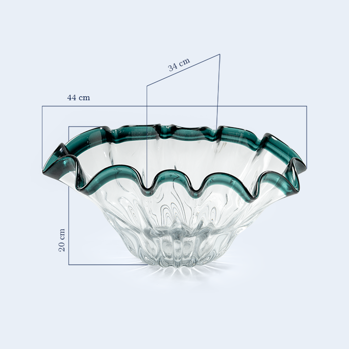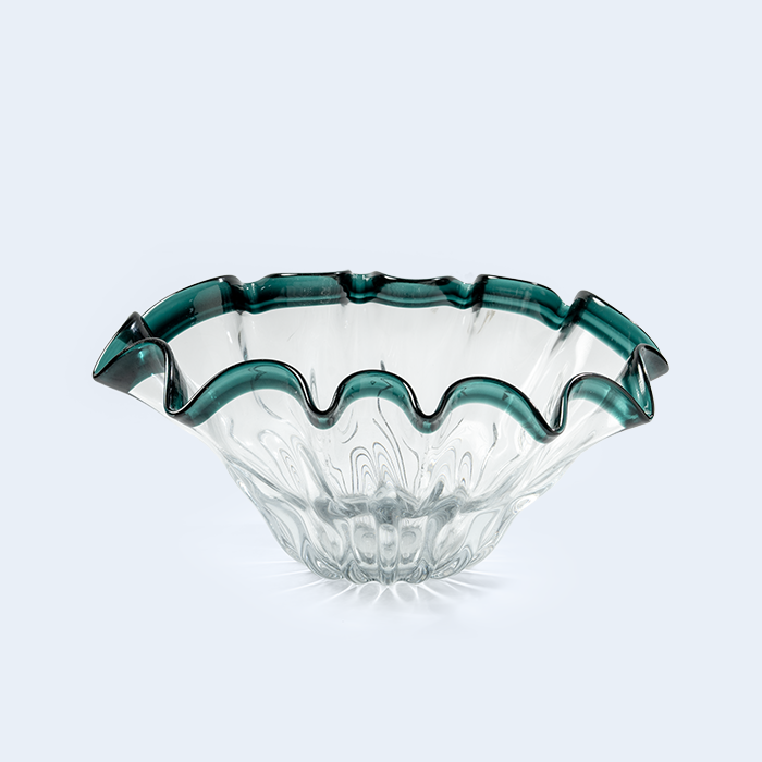 Ocelea  – A rippled glass centerpiece with a deep sea-green rim, Ocelea flows like gentle ocean waves, perfect for presenting fruits, chocolates, or florals with fresh, coastal elegance.