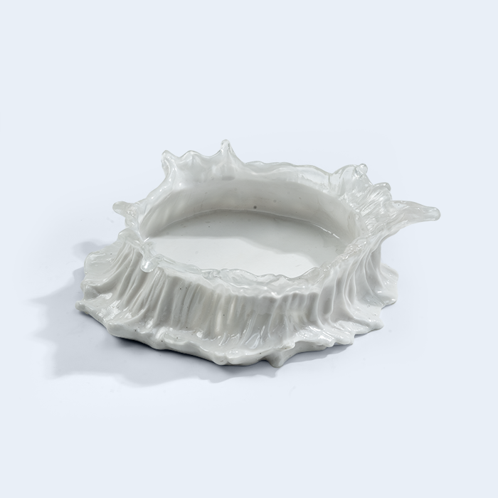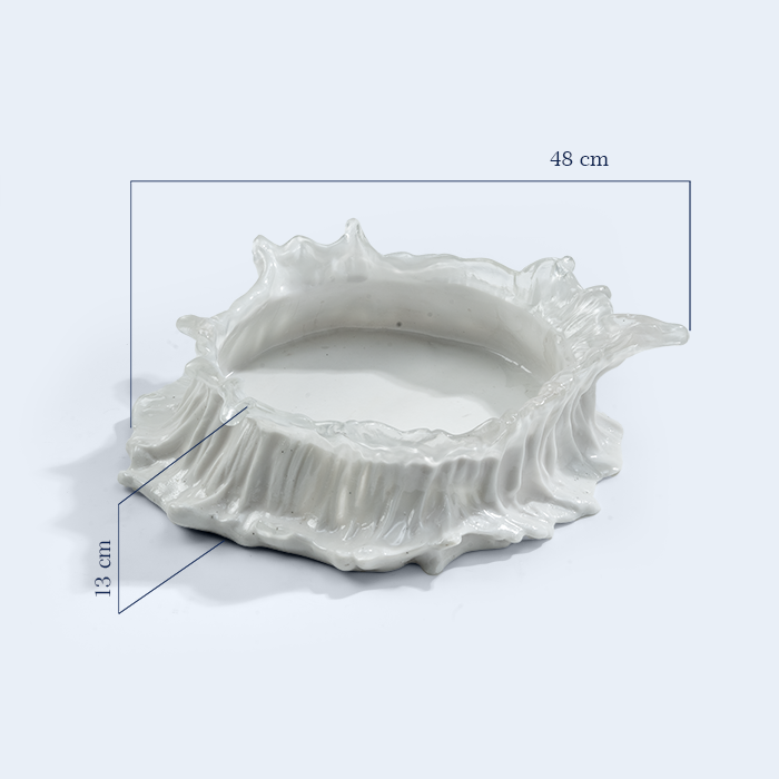 Ravena – Snow has a fluid, sculpted rim that looks like a frozen splash, finished in a soft porcelain-white glaze. A dramatic yet minimal centerpiece, perfect for desserts, dates or candles, it brings quiet winter-luxury to any table.
