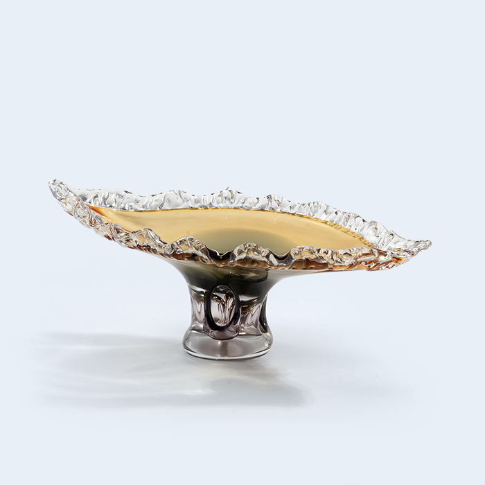 Vesperia Tray – A ruffled pedestal glass centerpiece in soft sunset amber, Vesperia spreads gracefully across the table, perfect for showcasing cakes, fruits, or dates with warm, evening-glow elegance.